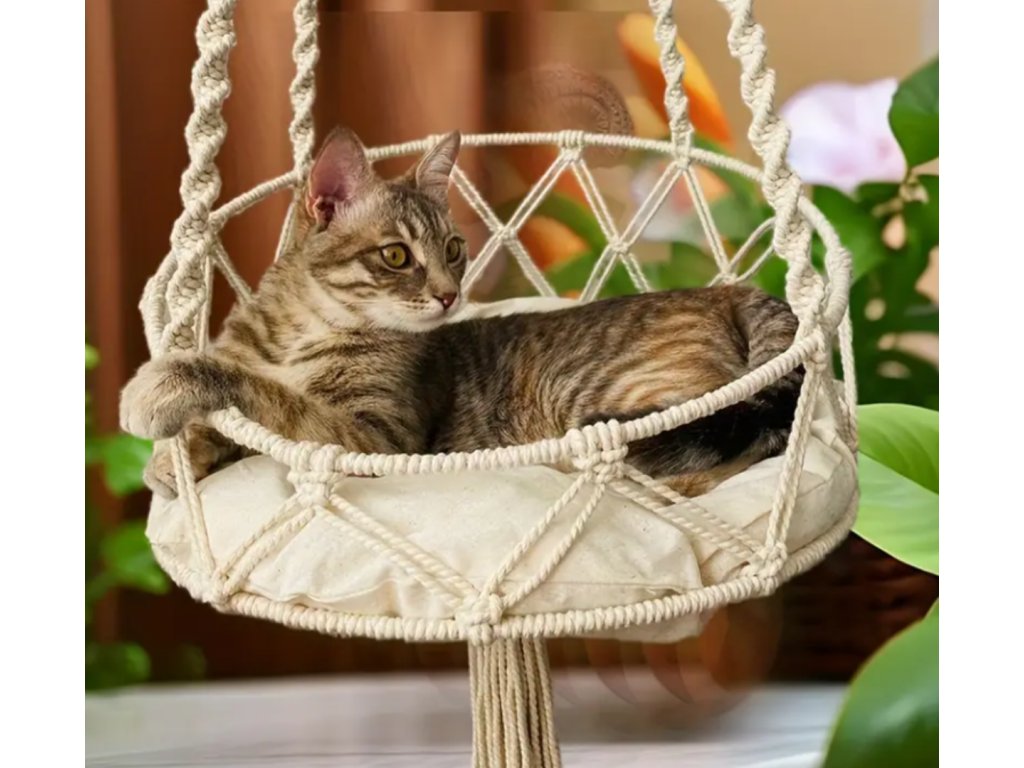 Táto závesná postieľka pre mačky je vyrobená z odolných a prírodných materiálov, ktoré zabezpečujú stabilitu a dlhú životnosť. Ručne tkané ozdoby dodávajú celému dizajnu bohémsky nádych a skvelo zapadnú do moderného aj rustikálneho interiéru.