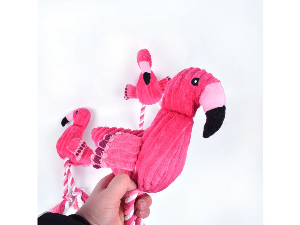 Vďaka svojmu nápadnému sfarbeniu priláka plameniak vzápätí pozornosť Vášho psíka a stane sa z neho kamarát na hranie. Vnútri sa ukrýva pískatko, ktoré po stlačení náležite pískne a podporuje psíka v hraní sa. Nohy tvorené lanami vyzývajú na hryzenie a ťahanie. Túto hračku môžete prípadne využiť aj ako aport. Tak svojmu miláčikovi poskytnete dlhú, rôznorodú zábavu!