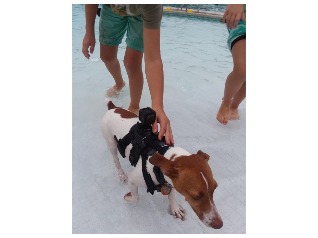 Postroj pre psa je ľahko umývateľný, popruhy jednoducho nastavíte alebo odopnete. Vďaka kvalitnému materiálu a polstrovaniu poskytuje pohodlie bez obmedzenia pohybu. Pevná konštrukcia zabezpečuje stabilitu kamery počas všetkých aktivít. Kameru je možné upevniť na chrbát alebo na hrudník. Pred upevnením vložte kameru do plastového obalu (obal nie je súčasťou balenia).