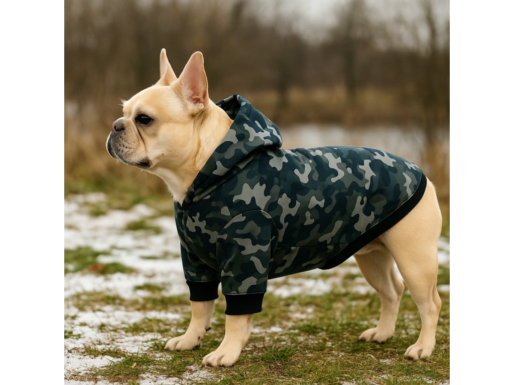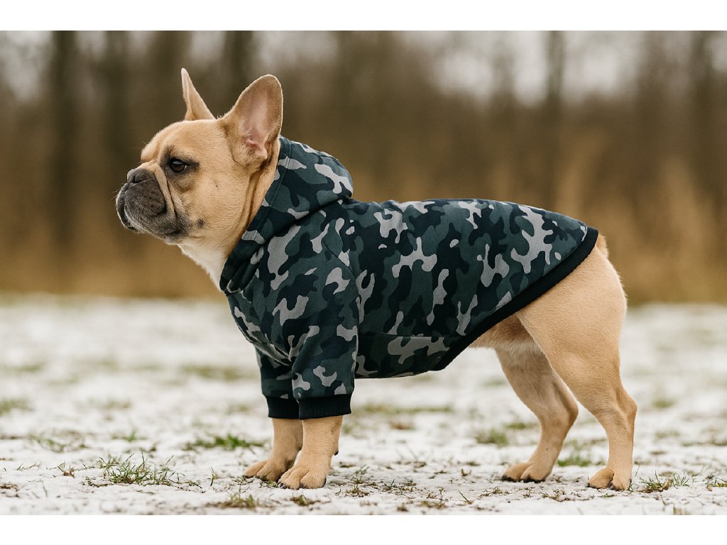 Moderný vzhľad – kapucňa a štýlový vzor zaraďujú mikinu medzi originálne oblečky pre psy, ktoré môžu pôsobiť aj ako luxusné oblečky pre psy.